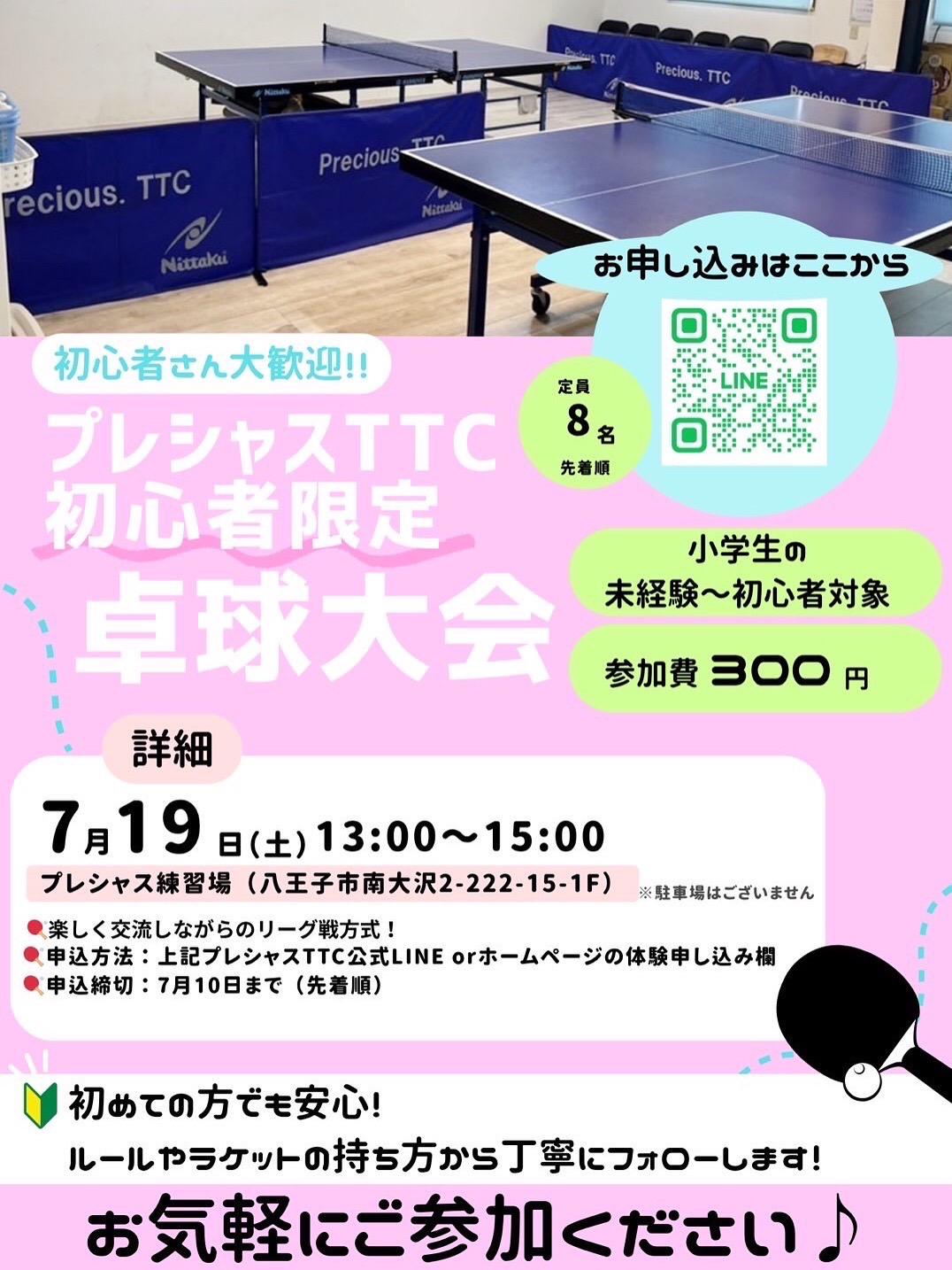 【イベント開催のお知らせ】 7月19日プレシャスTTC 初心者限定卓球大会(小学生の未経験~初心者対象)